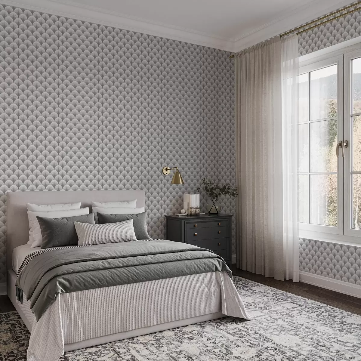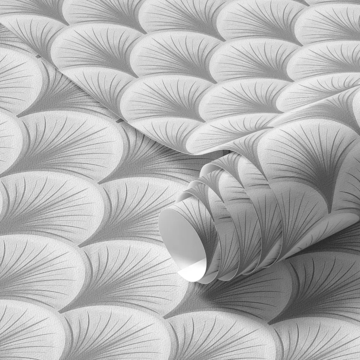 Papel tapiz Arcos en abanico grises contrastantes sobre fondo blanco. Nr. a00978v4