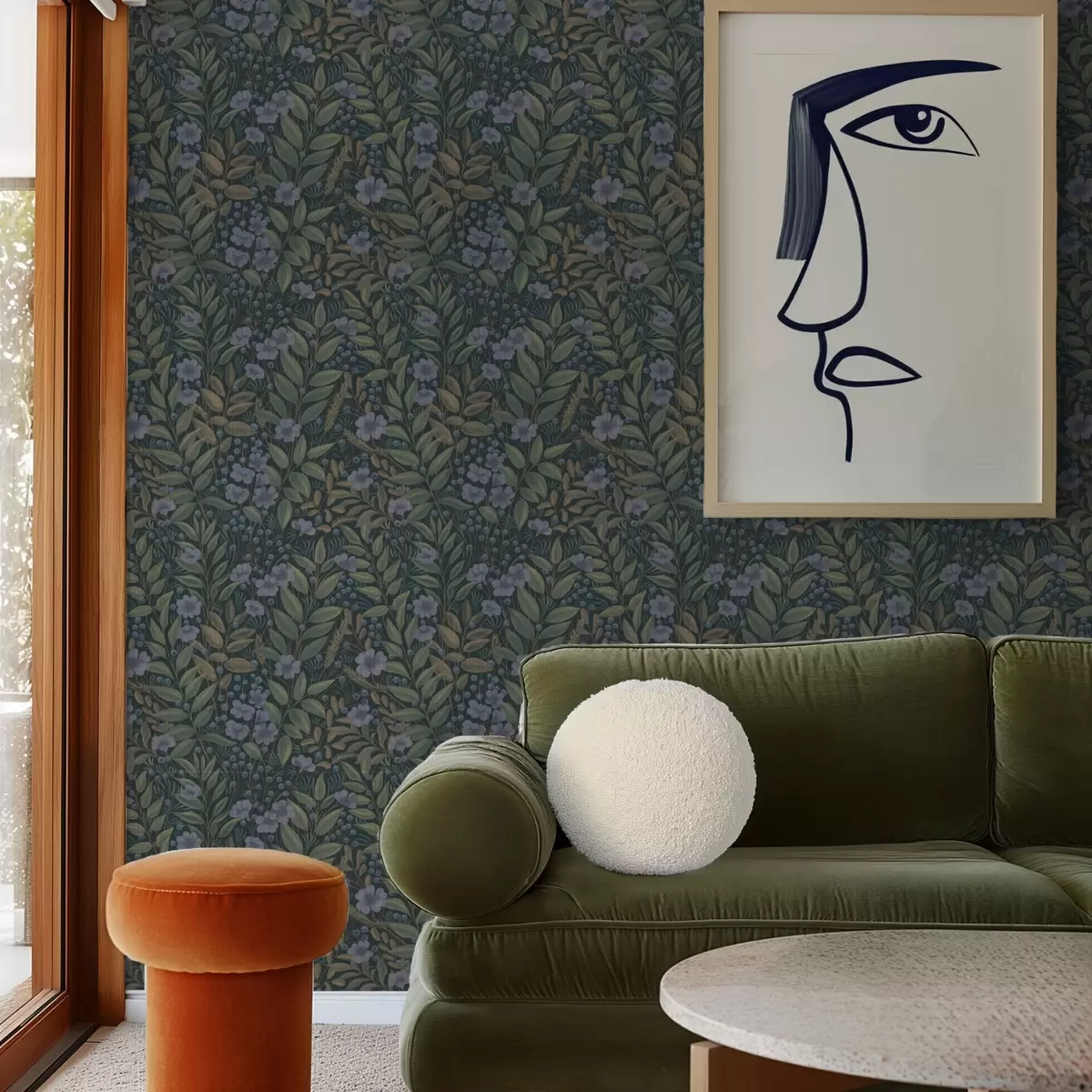 Papel tapiz Bayas silvestres y flores de lila sobre fondo carbón Nr. a00994v1