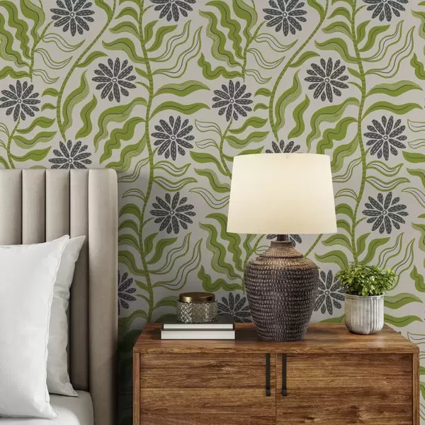 Papel tapiz Divertidas margaritas verdes con hojas onduladas sobre fondo crema Nr. a00998