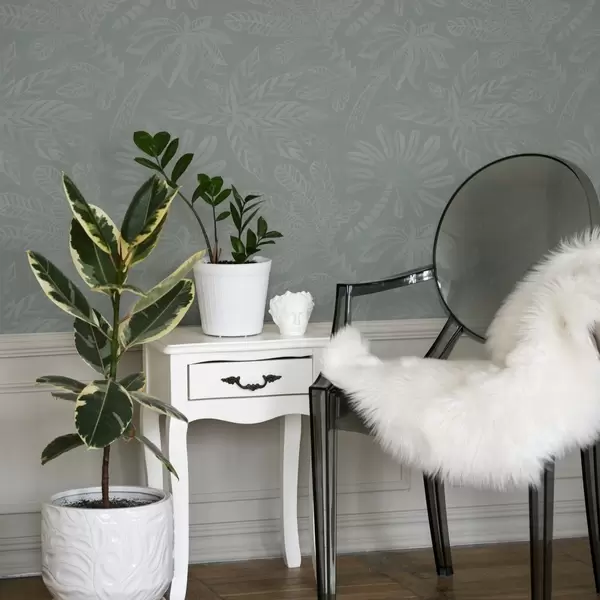 Papel tapiz Hojas tropicales grandes y mates en una paleta de colores gris menta Nr. a01001