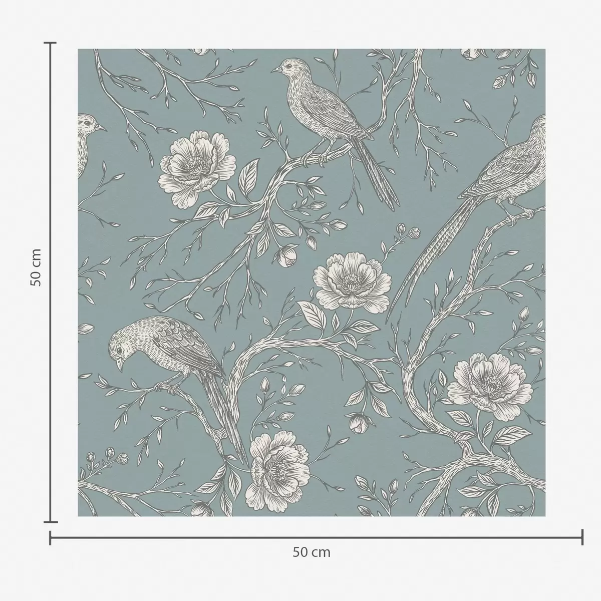 Papel tapiz Pájaros dibujados en contorno sobre ramas, fondo azul apagado. Nr. a01022
