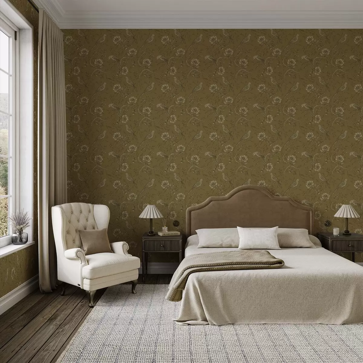 Papel tapiz Aves y flores vintage sobre un cálido fondo oliva. Nr. a01022v1