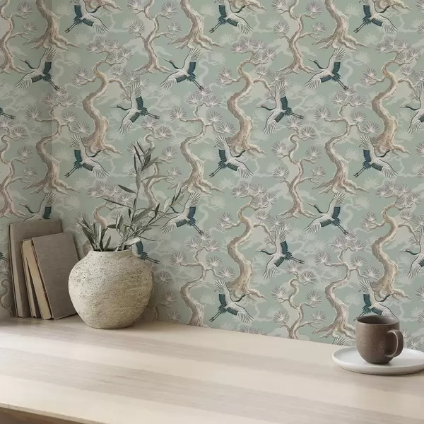 Papel tapiz Grullas entre ramas curvadas sobre un suave fondo color salvia Nr. a01023