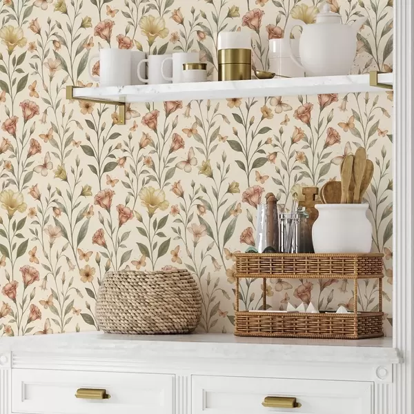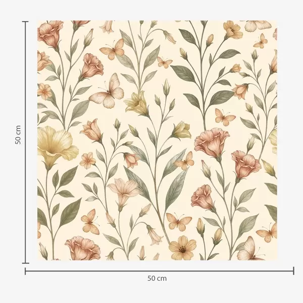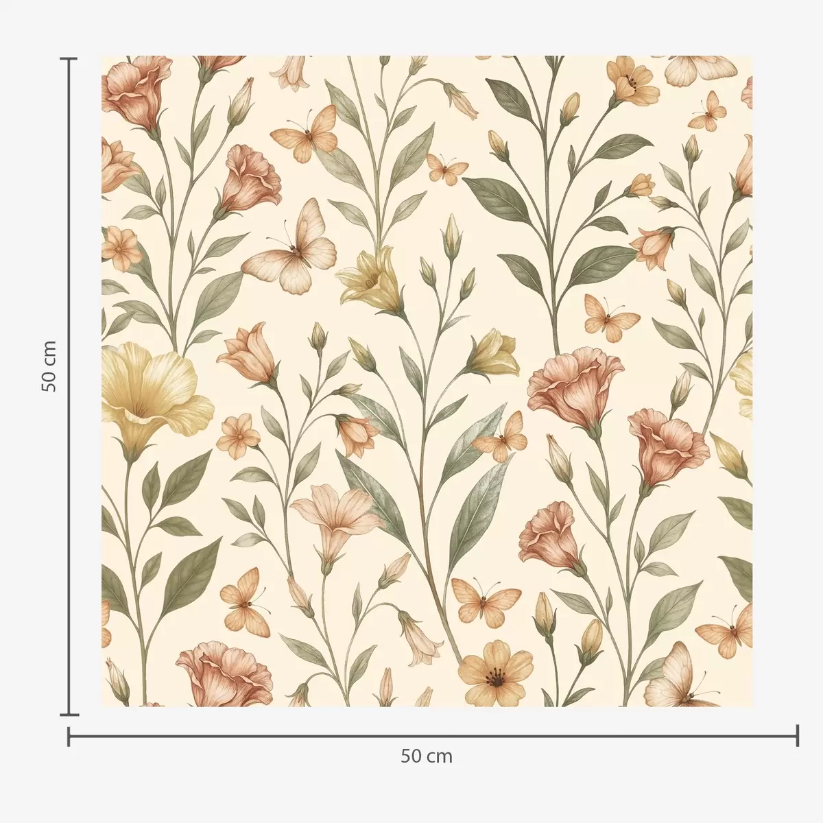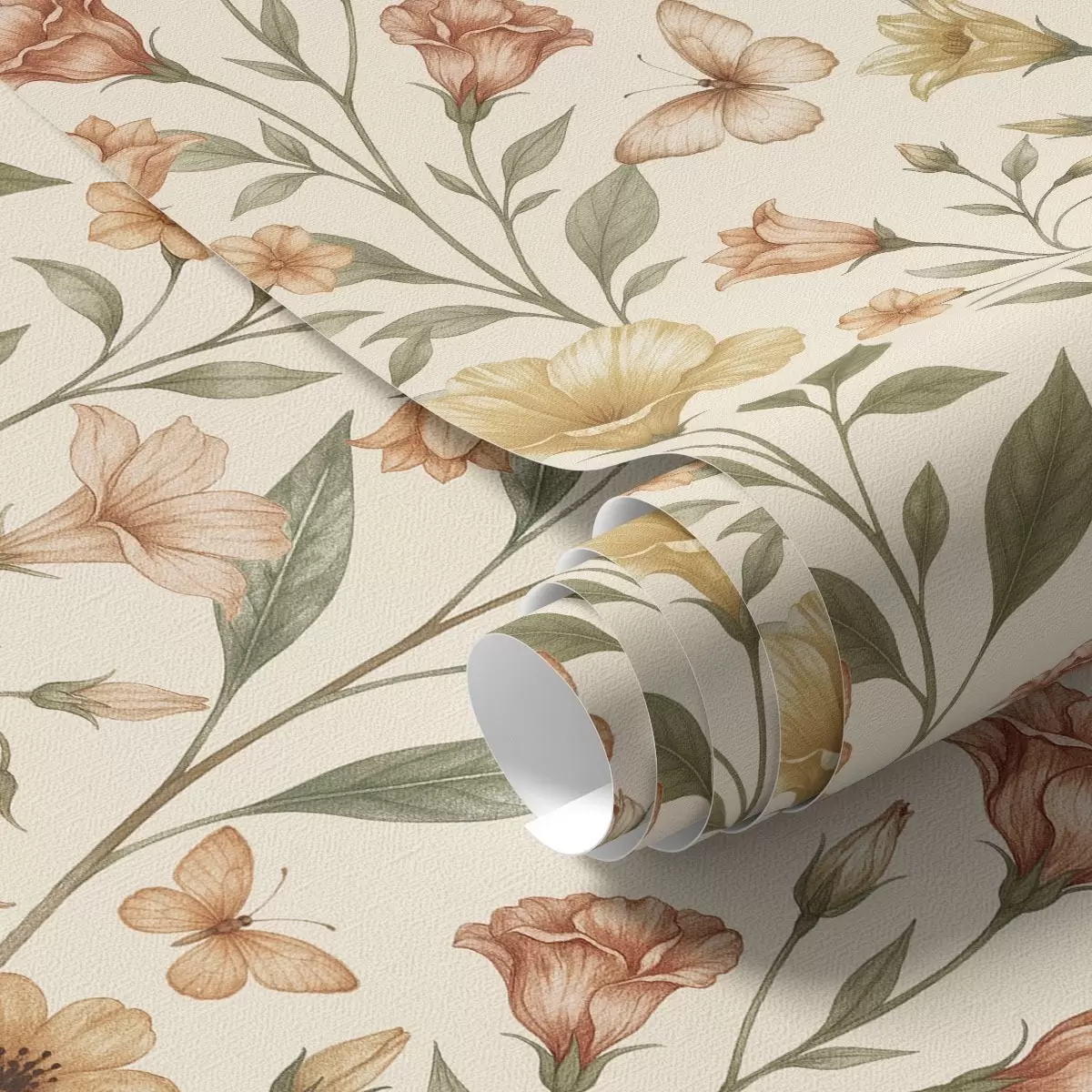 Papel tapiz Delicadas flores de melocotonero y mariposas sobre un cálido fondo color crema. Nr. a01026