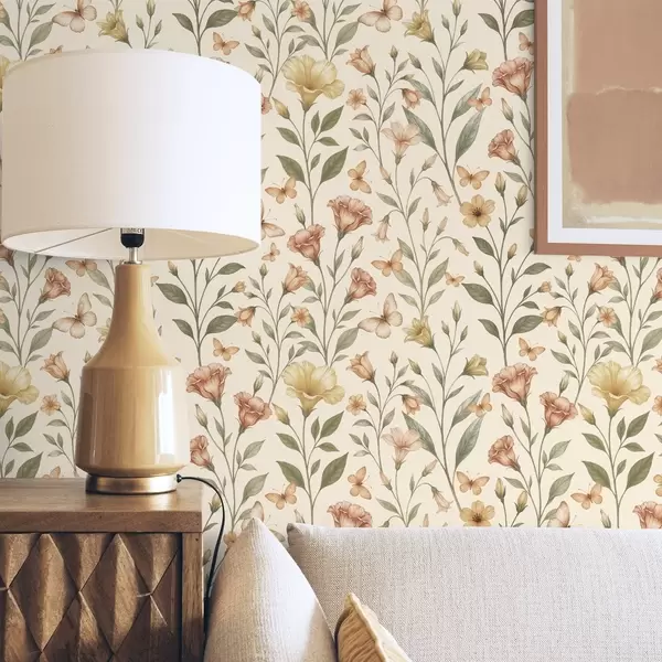 Papel tapiz Delicadas flores de melocotonero y mariposas sobre un cálido fondo color crema Nr. a01026