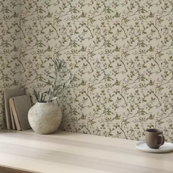 Papel tapiz Ramas ligeras con pequeñas flores color crema y hojas verdes Nr. a01028