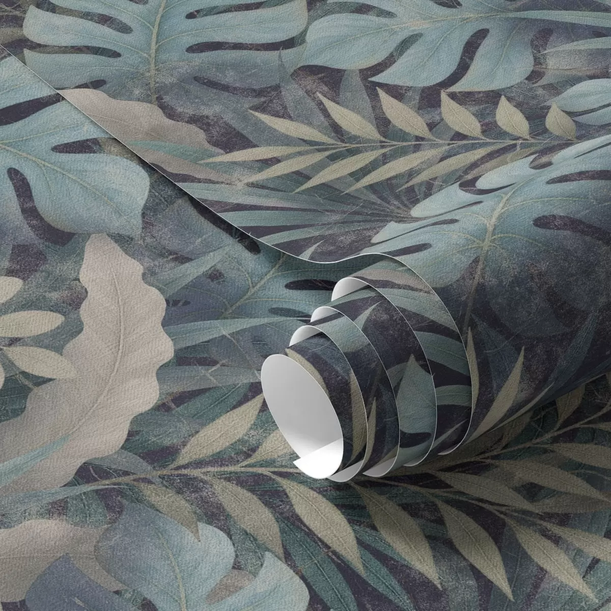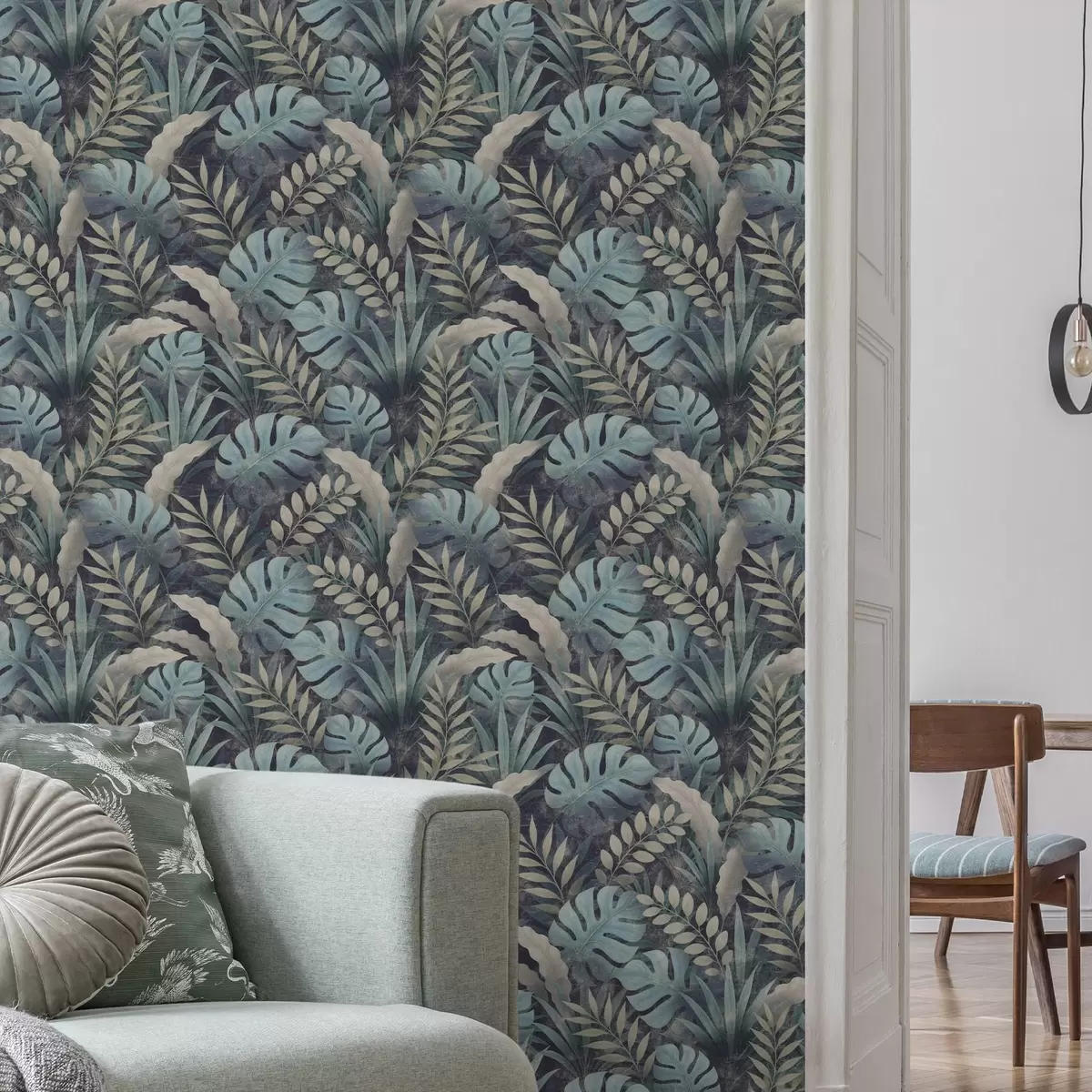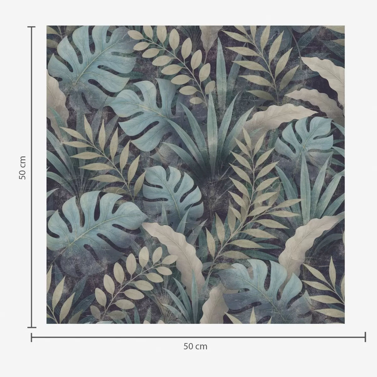 Papel tapiz Follaje tropical en tonos azul verdosos fríos. Nr. a01035