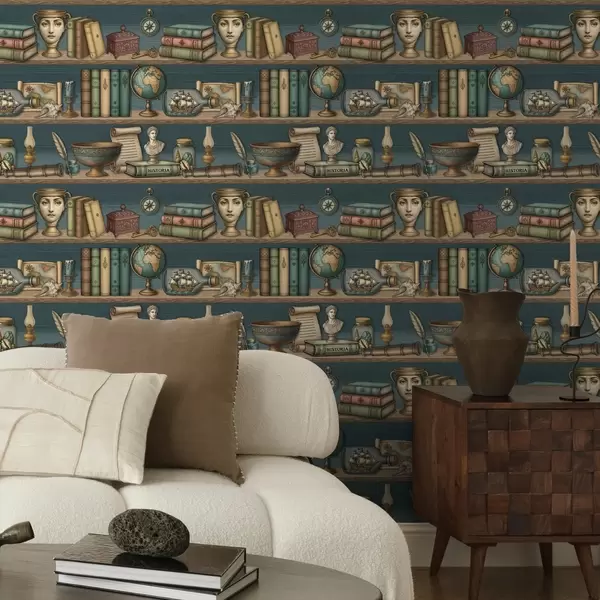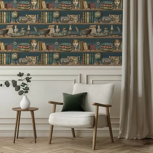 Papel tapiz Estanterías vintage con libros, un globo terráqueo y curiosidades marinas Nr. a01036