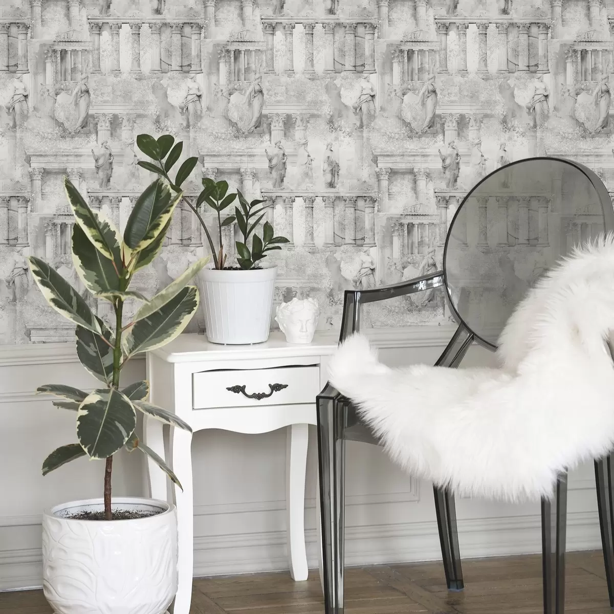 Papel tapiz Estatuas y columnas clásicas en tonos grises descoloridos. Nr. a01041v1