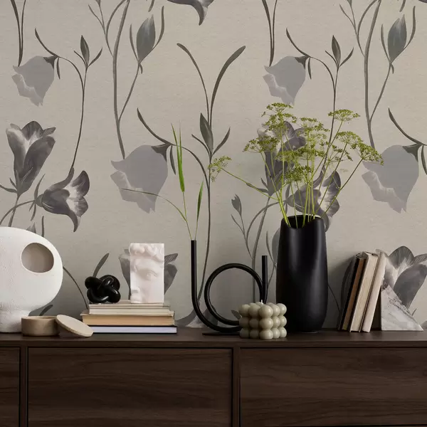 Papel tapiz Flores grises en forma de campana sobre fondo beige claro. Nr. a01119